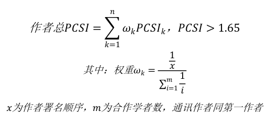 作者总PCSI,指的是作者发表的高于理论平均值(1.65)论文的PCSI的加权求和,权重与合作作者数量以及作者署名顺序相关。作者总PCSI公式如下: