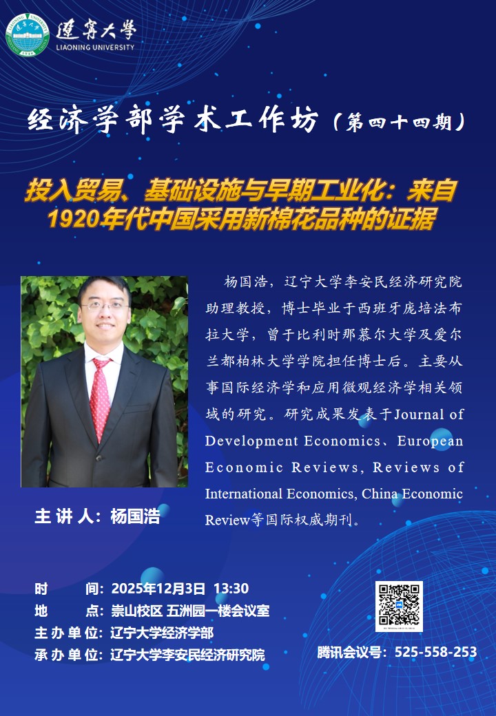 杨国浩,辽宁大学李安民经济研究院助理教授,博士毕业于西班牙庞培法布拉大学,曾于比利时那慕尔大学及爱尔兰都柏林大学学院担任博士后。主要从事国际经济学和应用微观经济学相关领域的研究。研究成果发表于Journal of Development Economics、European Economic Reviews, Reviews of International Economics, China Economic Review等国际权威期刊。